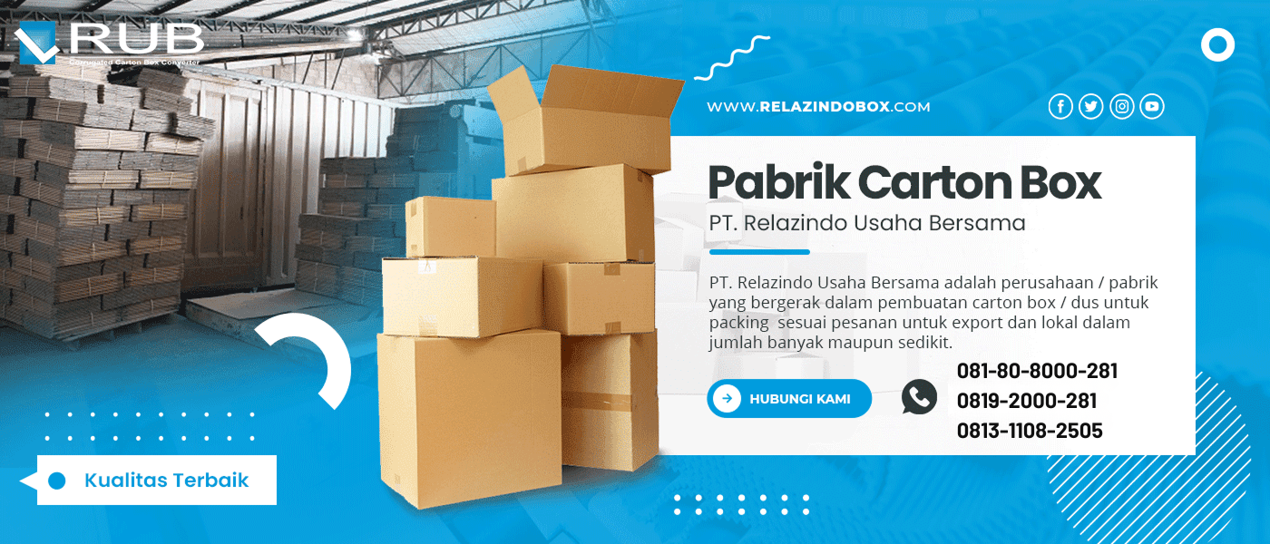 PT. Relazindo Usaha Bersama adalah perusahaan / pabrik yang bergerak dalam pembuatan carton box / dus untuk packing furniture, garment, air minum, makanan dan lainnya sesuai pesanan untuk export dan lokal dalam jumlah banyak maupun sedikit.
